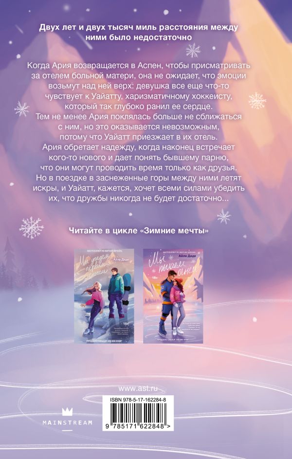 Оставить отзывКогда Ария возвращается в Аспен, чтобы присматривать за отелем больной матери, она не ожидает, что эмоции возьмут над ней верх: девушка все еще что-то чувствует к Уайатту, харизматичному хоккеисту, который так глубоко ранил ее сердце. Тем не менее Ария поклялась больше не сближаться с ним, но это оказывается невозможным, потому что Уайатт приезжает в их отель.