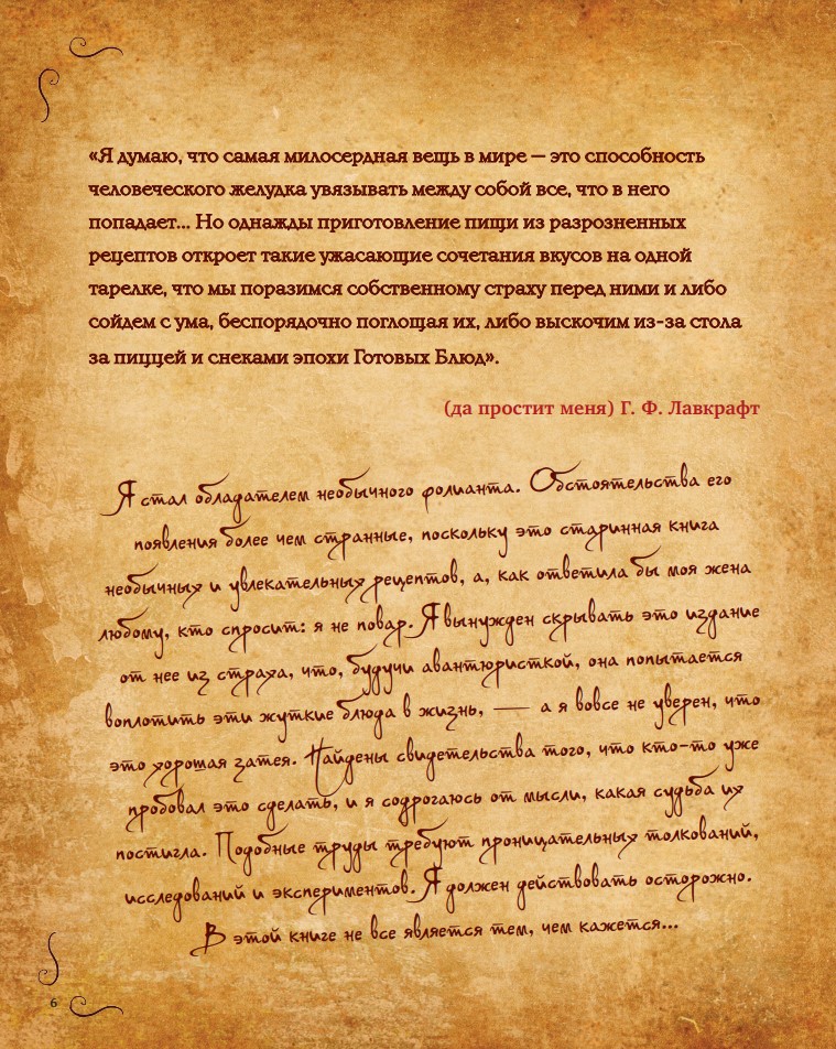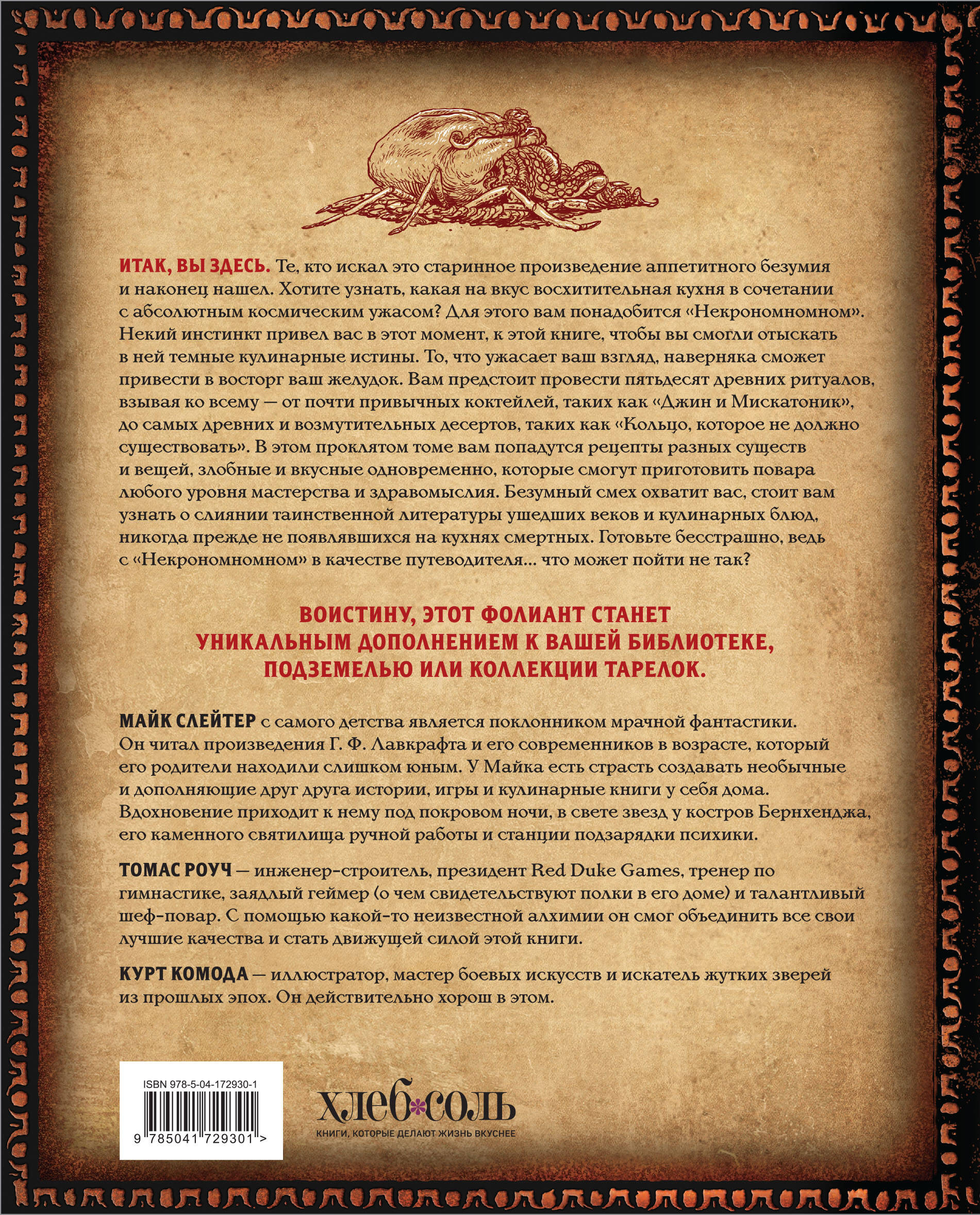 Майк Слейтер, истинный поклонник мрачной фантастики и Г. Ф. Лавкрафта, воплотил свою любовь к его произведениям в поистине ужасающей кулинарной книге «Некрономномном». На страницах этого фолианта вы обретете таинственные знания об ингредиентах и рецептах. Целых 8 разделов станут вашими спутниками на этом нелегком пути.