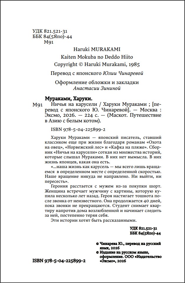 Харуки Мураками – японский писатель, ставший классиком еще при жизни благодаря романам «Охота на овец», «Норвежский лес» и «Кафка на пляже». Сборник «Ничья на карусели» соткан из множества историй, которые слышал Мураками. В них нет вымысла. В них жизнь японцев, какая она есть.
