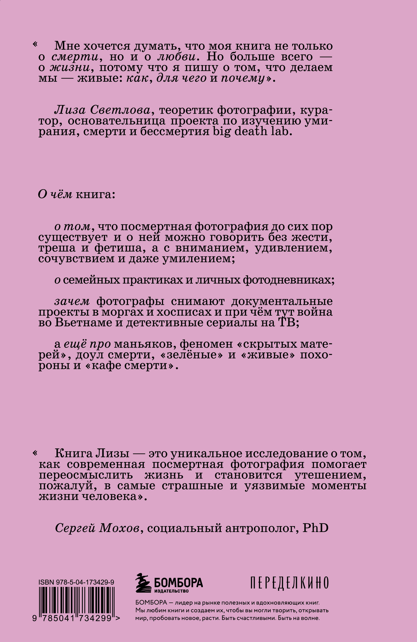 Что вы представляете, когда слышите «посмертная фотография»? Пугающие снимки наряженных мертвецов из Викторианской эпохи? Или случайно найденные карточки с деревенских похорон? Каждый из нас сталкивался с этим явлением, часто задаваясь вопросом: а зачем вообще это нужно? Автор этой книги Лиза Светлова рассказывает не только об истории посмертной фотографии, но и о ее настоящем, объясняет, как через подобные практики мы учимся не бояться смерти, а принимать ее и смиряться с утратой близких людей.