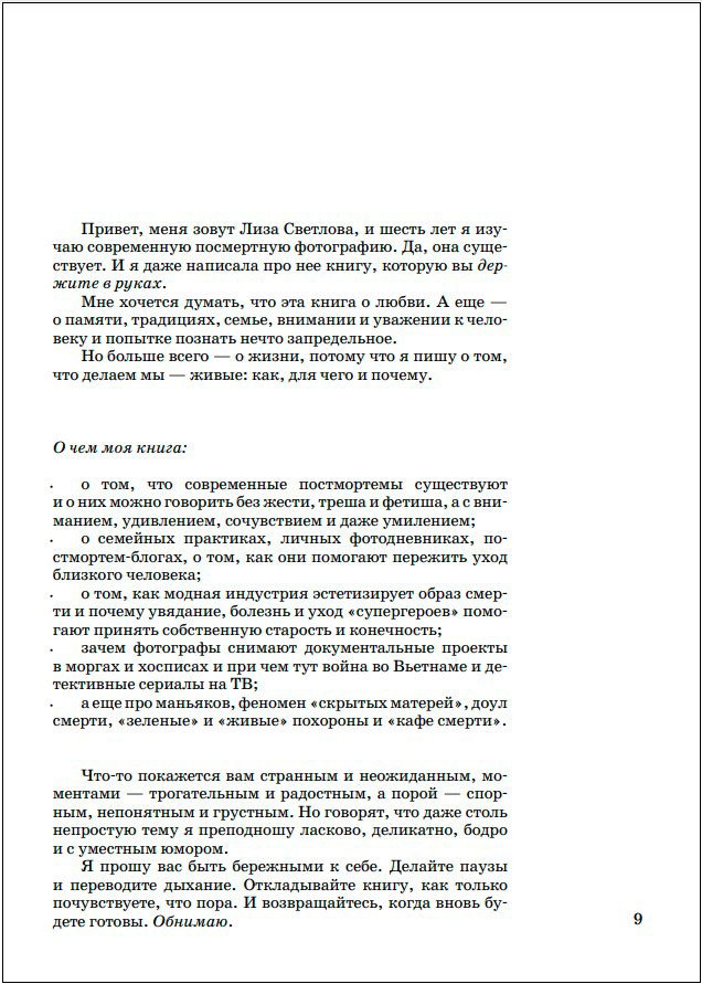 В книге вы найдете не только все актуальные исследования, но и инструкции по самопомощи при потере родных и друзей, а также личные истории и мировой опыт исследователей и фотографов, занимающихся постмортемами. Часть фотографий внутри предоставлены самим автором, часть прислали люди, которые поделились своим опытом проживания горя.
