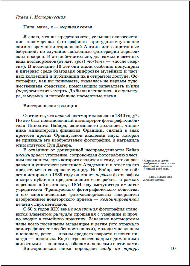 Оставить отзывЧто вы представляете, когда слышите «посмертная фотография»? Пугающие снимки наряженных мертвецов из Викторианской эпохи? Или случайно найденные карточки с деревенских похорон? Каждый из нас сталкивался с этим явлением, часто задаваясь вопросом: а зачем вообще это нужно? Автор этой книги Лиза Светлова рассказывает не только об истории посмертной фотографии, но и о ее настоящем, объясняет, как через подобные практики мы учимся не бояться смерти, а принимать ее и смиряться с утратой близких людей.