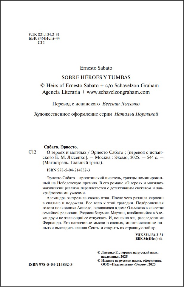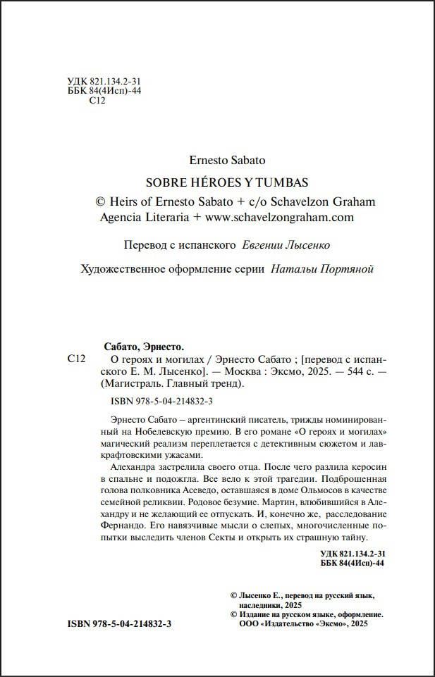Эрнесто Сабато – аргентинский писатель, трижды номинированный на Нобелевскую премию. В его романе «О героях и могилах» магический реализм переплетается с детективным сюжетом и «Лавкрафтовскими ужасами».