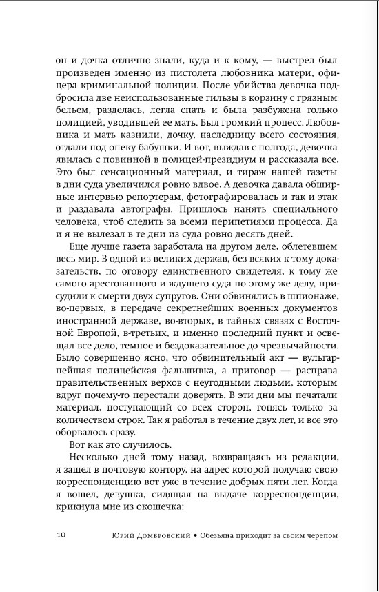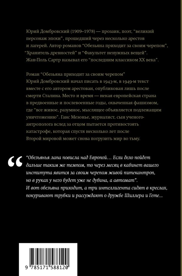 Роман «Обезьяна приходит за своим черепом» Юрий Домбровский начал писать в 1943-м, в 1949-м текст вместе с его автором арестован, опубликован лишь после смерти Сталина. Место и время – некая европейская страна в предвоенные и послевоенные годы, охваченная фашизмом, где «все живое, разумное, мыслящее объявляется подлежащим уничтожению». Ганс Мезонье, журналист, сын ученого-антрополога вслед за отцом пытается противостоять катастрофе, которая спустя несколько лет после Второй мировой может снова погрузить мир во тьму.