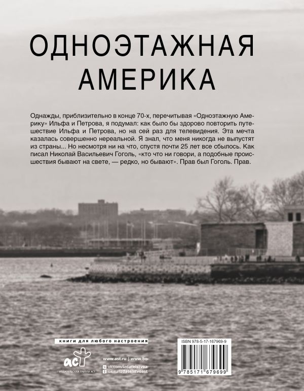 Оставить отзывОднажды, приблизительно в конце 70-х, перечитывая «Одноэтажную Америку» Ильфа и Петрова, я подумал: как было бы здорово повторить путешествие Ильфа и Петрова, но на сей раз для телевидения. Эта мечта казалась совершенно нереальной. Я знал, что меня никогда не выпустят из страны... Но несмотря ни на что, спустя почти 25 лет все сбылось. Как писал Николай Васильевич Гоголь, «кто что ни говори, а подобные происшествия бывают на свете, – редко, но бывают». Прав был Гоголь. Прав.
