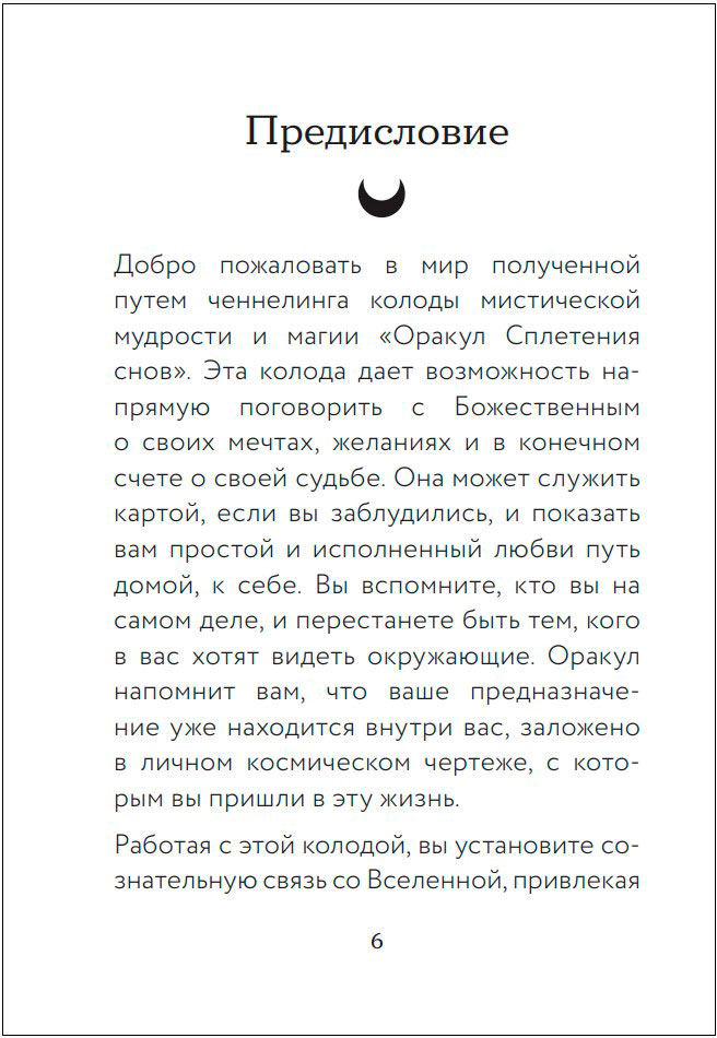 Каждая карта в «Оракуле Сплетения снов» несет образ и метафору, которые отражают ваш личный опыт, и напоминает, что вы тоже являетесь могущественным Плетельщиком, ткущим свои надежды и мечты и воплощающим желания.