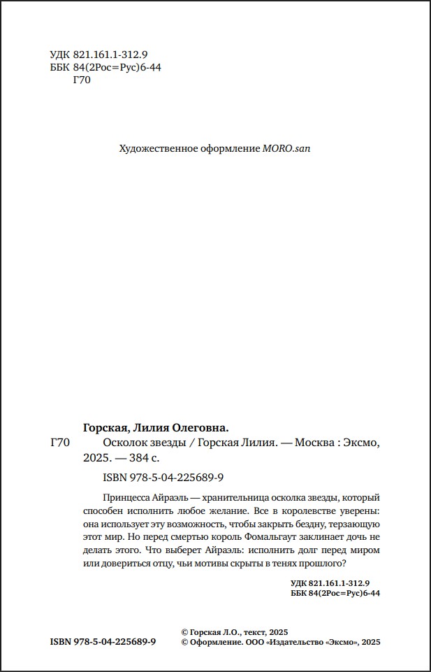 Оставить отзывПринцесса Айраэль, хранительница осколка звезды, который способен исполнить любое желание. Все в королевстве уверены: она использует эту возможность, чтобы закрыть бездну, терзающую этот мир. Но перед смертью король Фомальгаут заклинает дочь не делать этого. Что выберет Айраэль: исполнить долг перед миром или довериться отцу, чьи мотивы скрыты в тенях прошлого?