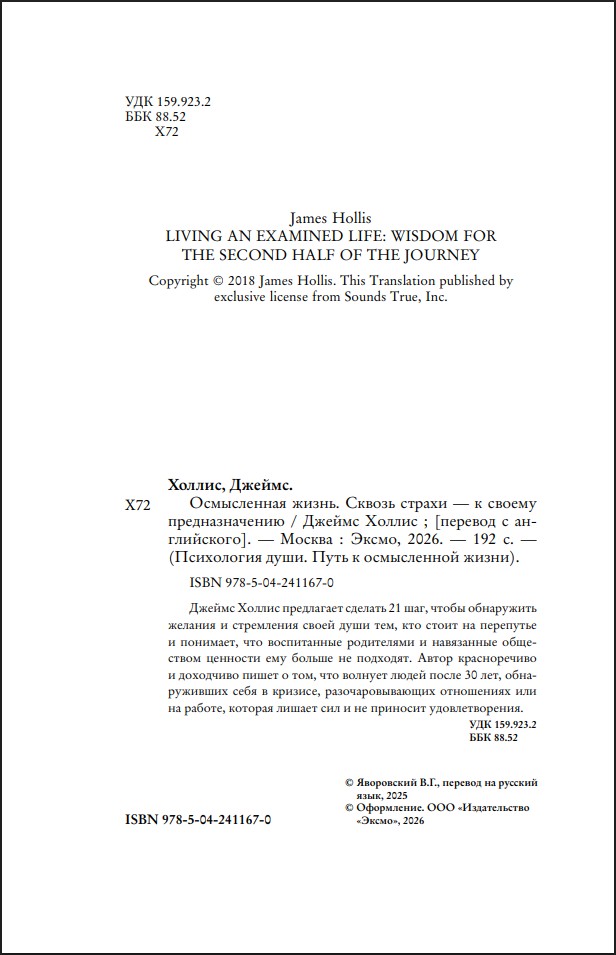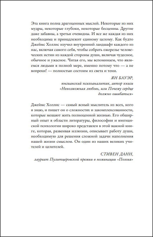 Оставить отзывДжеймс Холлис предлагает сделать 21 шаг, чтобы обнаружить желания своей души и стремления тем, кто стоит на перепутье и понимает, что воспитанные родителями и навязанные обществом ценности ему больше не подходят.