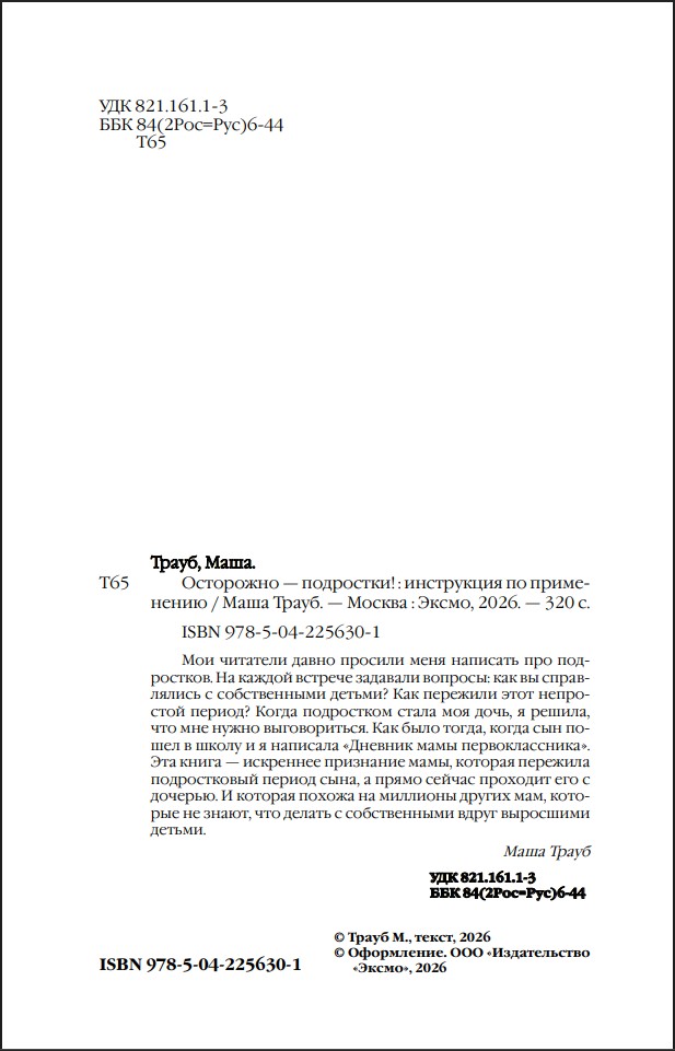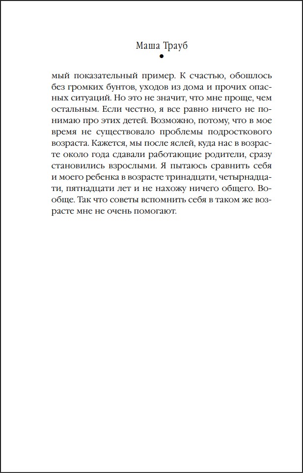 Эта книга – искреннее признание мамы, которая пережила подростковый период сына, а прямо сейчас проходит его с дочерью. И которая похожа на миллионы других мам, которые не знают, что делать с собственными вдруг выросшими детьми». – Маша Трауб
