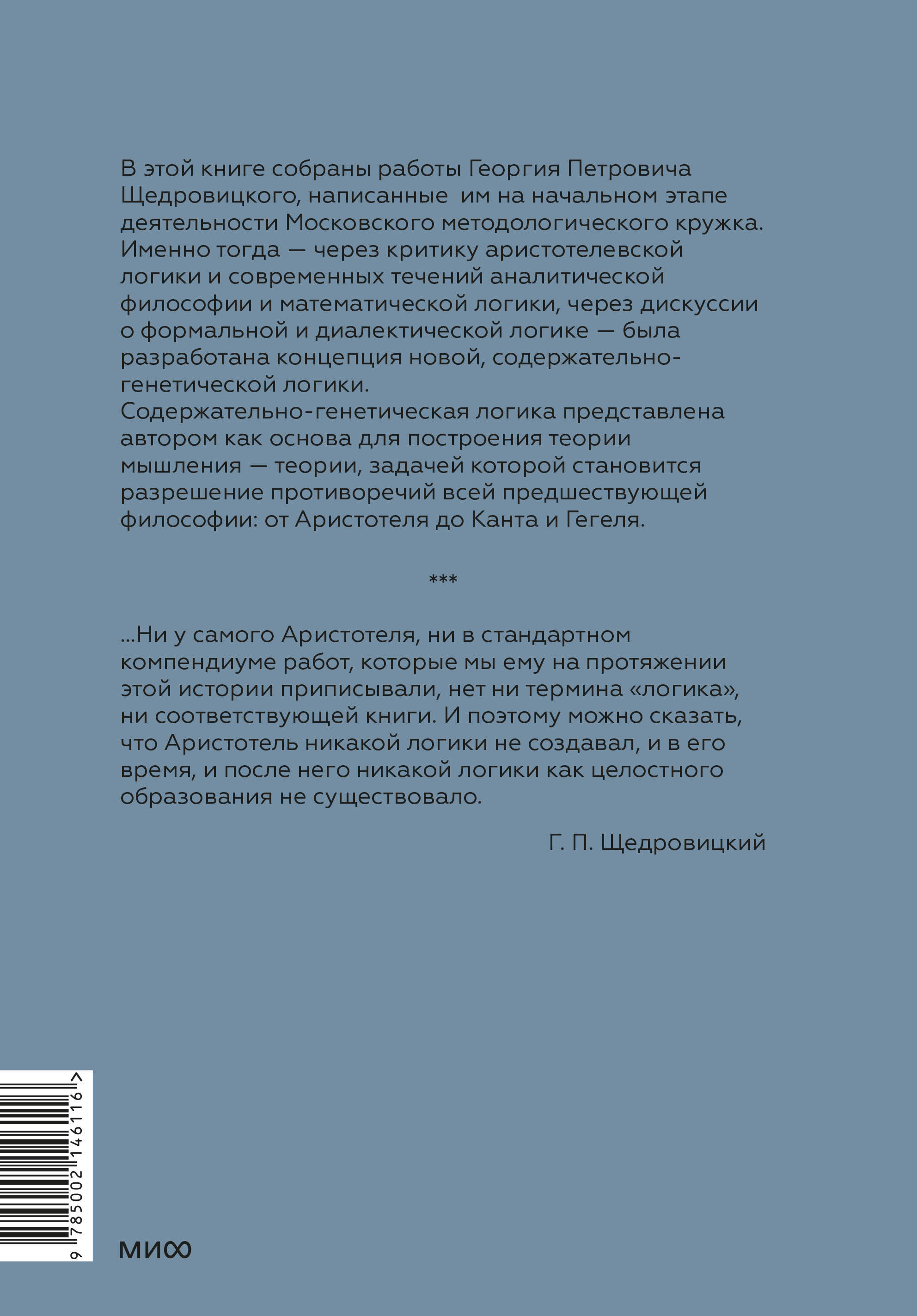 Помимо уже публиковавшихся ранее статей в книге впервые представлены программные доклады, лекции, статьи, другие материалы из личного архива Г. П. Щедровицкого. Именно через критику аристотелевской логики и современных течений аналитической философии и математической логики, через дискуссии о формальной и диалектической логике была разработана концепция новой, содержательно- генетической логики.
