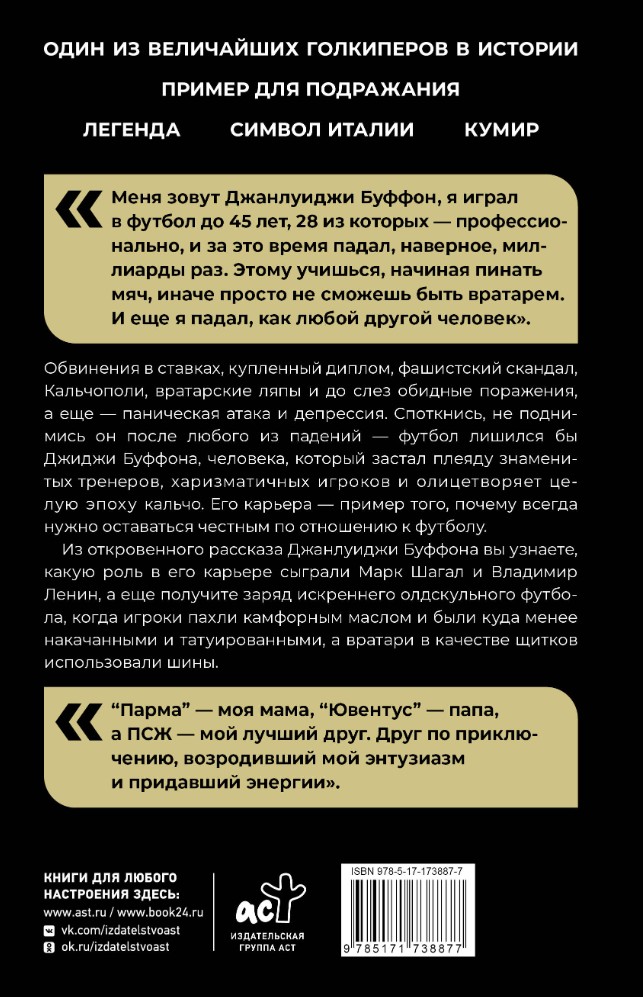 Оставить отзыв«Меня зовут Джанлуиджи Буффон, я играл в футбол до 45 лет, 28 из которых – профессионально, и за это время падал, наверное, миллиарды раз. Этому учишься, начиная пинать мяч, иначе просто не сможешь быть вратарем. И еще я падал, как любой другой человек».