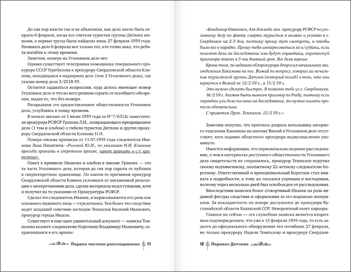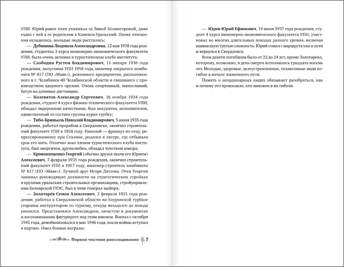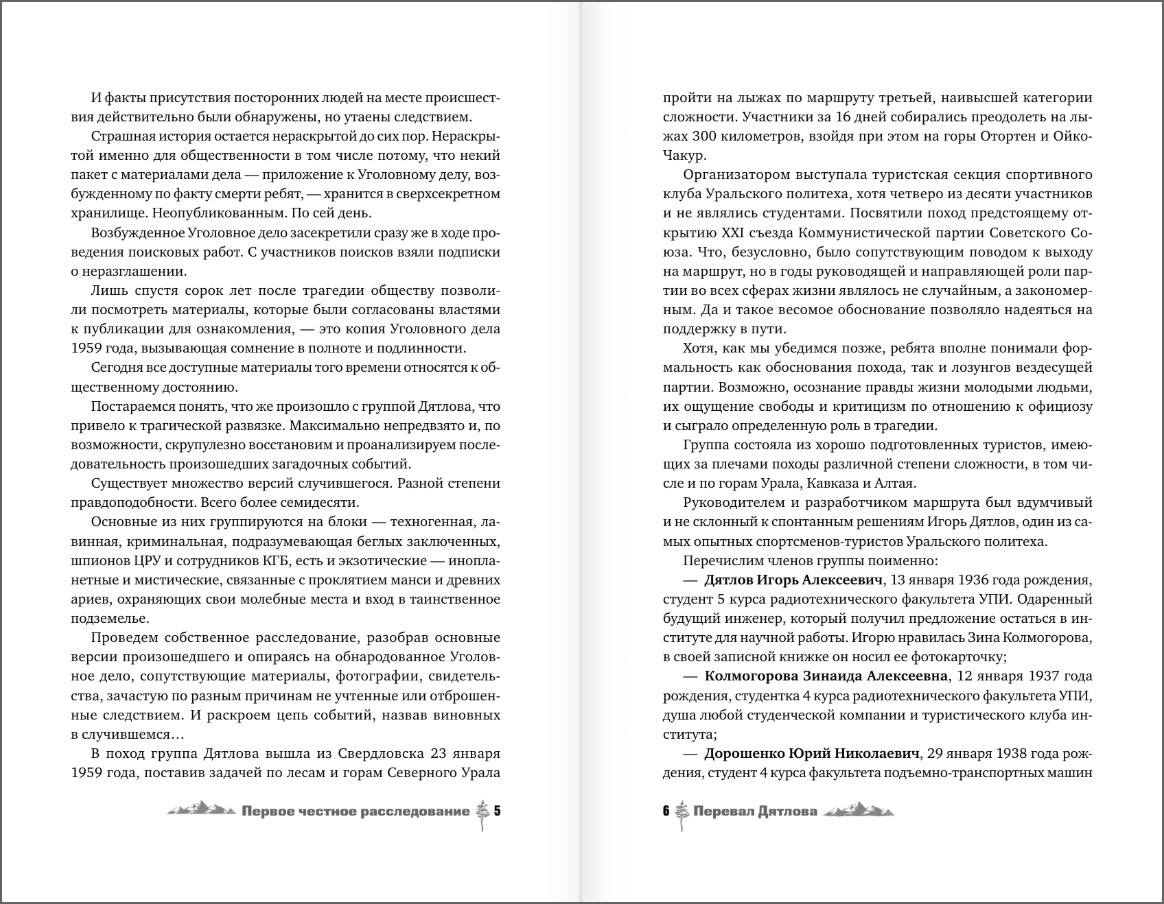 Детальное рассмотрение обстоятельств гибели туристов опирается на архивные документы, фотографии с пленок участников похода, свидетельства современников и улики, на которые раньше закрывали глаза. Книга рассказывает не только о последнем походе дятловцев, но и об их жизни, приметах времени и характерах живших тогда людей.