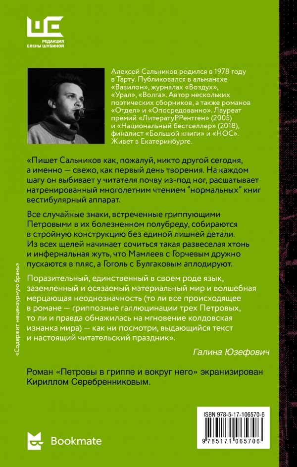 Оставить отзывАлексей Сальников родился в 1978 году в Тарту. Публиковался в альманахе «Вавилон», журналах «Воздух», «Урал», «Волга». Автор трех поэтических сборников. Лауреат премий «ЛитератуРРентген» (2005) и «Национальный бестселлер (2018), финалист «Большой книги» и «НОС». Живет в Екатеринбурге.