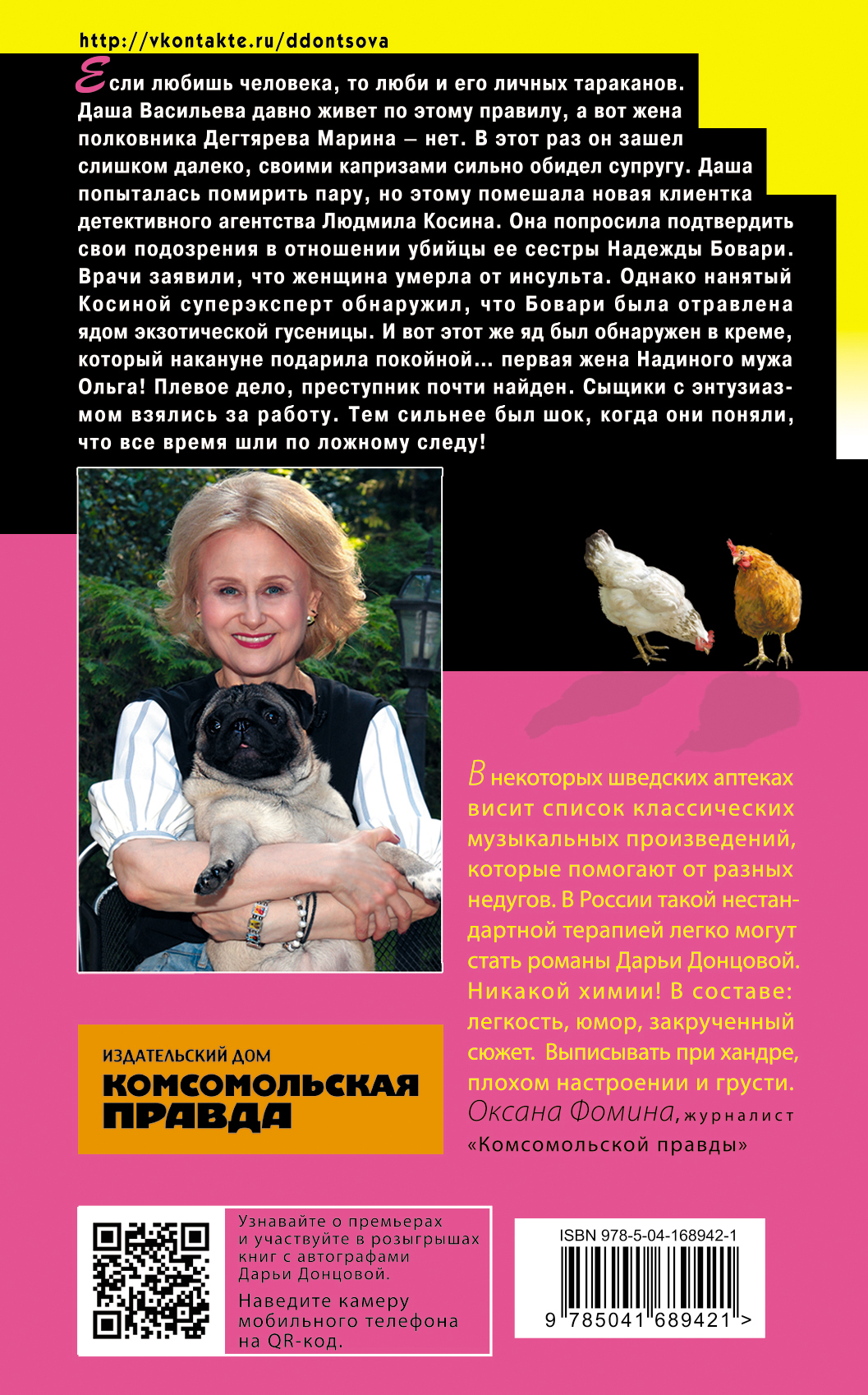 Оставить отзывЕсли любишь человека, то люби и его личных тараканов. Даша Васильева давно живет по этому правилу, а вот жена полковника Дегтярева Марина – нет. В этот раз он зашел слишком далеко, своими капризами сильно обидел свою вторую половину. Даша попыталась помирить пару, но этому помешала новая клиентка детективного агентства Людмила Косина. Она попросила подтвердить свои подозрения в отношении убийцы ее сестры Надежды Бовари. Врачи заявили, что женщина умерла от инсульта. Однако нанятый Косиной суперэксперт обнаружил, что Бовари была отравлена ядом экзотической гусеницы. И вот этот же яд был обнаружен в креме, который накануне подарила покойной… первая жена Надиного мужа Ольга! Плевое дело, преступник почти найден. Сыщики с энтузиазмом взялись за работу. Тем сильнее был шок, когда они поняли, что все время шли по ложному следу!