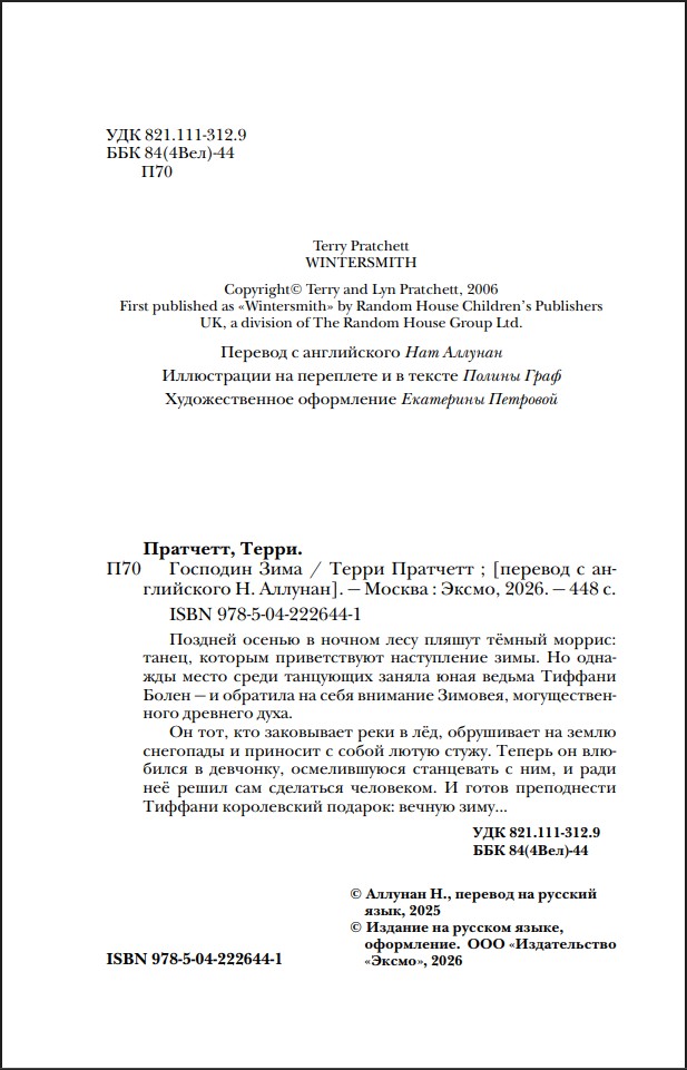 Оставить отзывПоздней осенью в ночном лесу пляшут тёмный моррис: танец, которым приветствуют наступление зимы. Но однажды место среди танцующих заняла юная ведьма Тиффани Болен – и обратила на себя внимание Зимовея, могущественного древнего духа.