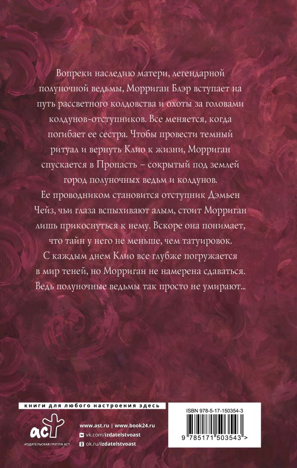 Вопреки наследию матери, легендарной полуночной ведьмы, Морриган Блэр вступает на путь рассветного колдовства и охоты за головами колдунов-отступников. Все меняется, когда погибает ее сестра. Чтобы провести темный ритуал и вернуть Клио к жизни, Морриган спускается в Пропасть – сокрытый под землей город полуночных ведьм и колдунов. Ее проводником становится отступник Дэмьен Чейз, чьи глаза вспыхивают алым, стоит Морриган лишь прикоснуться к нему. Вскоре она понимает, что тайн у него не меньше, чем татуировок. С каждым днем Клио все глубже погружается в мир теней, но Морриган не намерена сдаваться. Ведь полуночные ведьмы так просто не умирают...