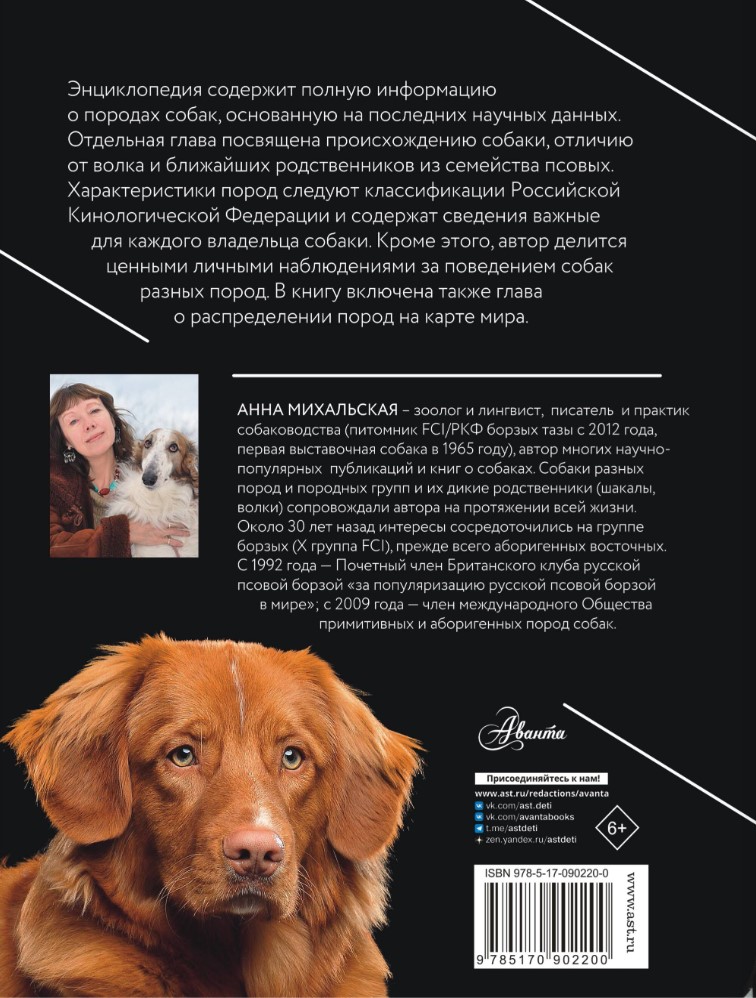 Энциклопедия содержит полную информацию о породах собак, основанную на последних научных данных. Отдельная глава посвящена происхождению собаки, ее одомашниванию, отличительным чертам от волка и ближайших родственников из семейства псовых. Характеристики пород следуют классификации Российской Кинологической Федерации и содержат сведения важные для каждого владельца собаки. Кроме этого, автор делится ценными личными наблюдениями за поведением собак разных пород. В книгу включена также глава о распределении пород на карте мира.