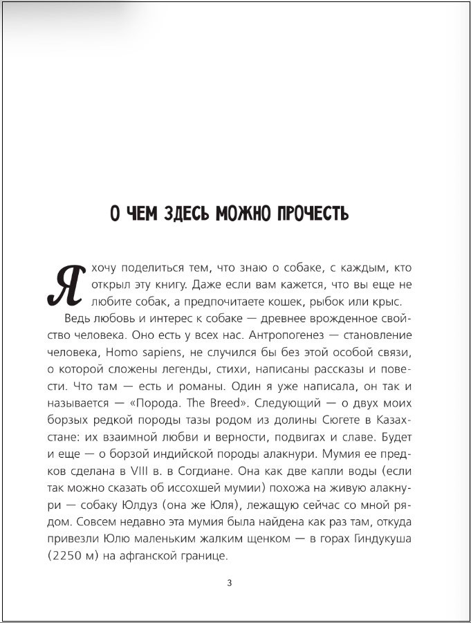Характеристики породных групп и пород следуют классификации РКФ и содержат сведения, необходимые каждому владельцу для понимания особенностей поведения собаки и взаимодействия с ней. Автор делится и личными наблюдениями за дикими псовыми и поведением собак разных пород.