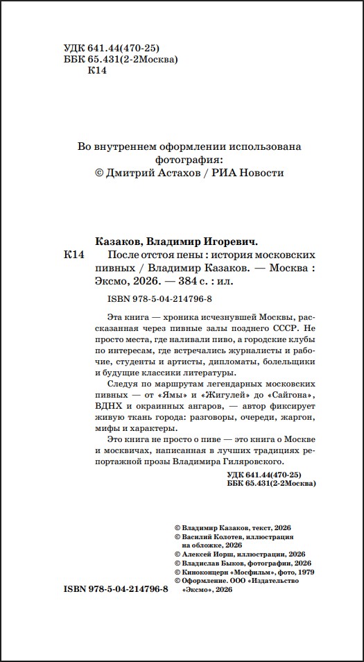 Владимир Казаков, автор культовых «Алкогольных хроник», впервые в отечественной публицистике подробно рассказывает о пивных залах позднесоветской Москвы – важнейшем, но почти неописанном социальном пространстве эпохи.