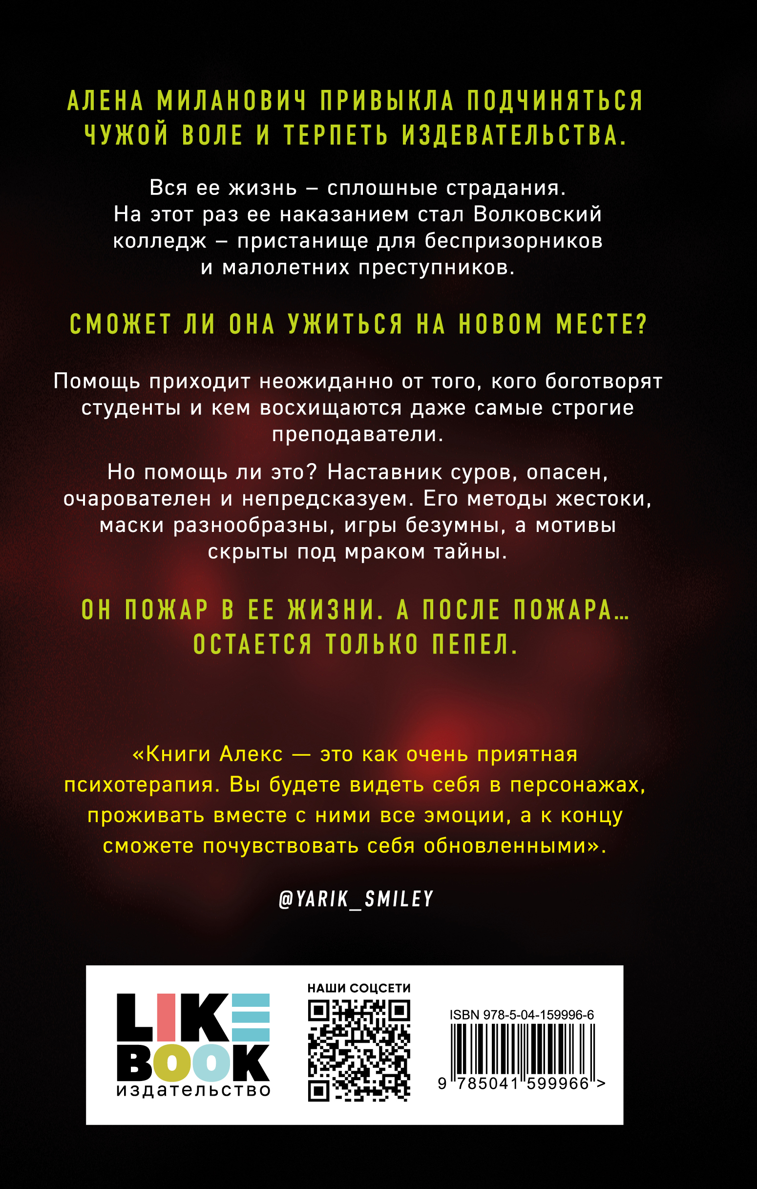 Вся ее жизнь – сплошные страдания. На этот раз ее наказанием стал Волковский колледж – пристанище для беспризорников и малолетних преступников. Сможет ли она ужиться на новом месте? Помощь приходит неожиданно, от того, кого боготворят студенты и кем восхищаются даже самые строгие преподаватели. Но помощь ли это? Наставник суров, опасен, очарователен и непредсказуем. Его методы жестоки, маски разнообразны, игры безумны, а мотивы скрыты под мраком тайны. Он – пожар в ее жизни. А после пожара… остается только пепел.