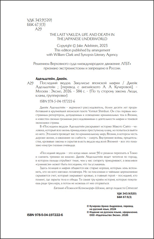 Джейк Адельштейн – журналист-расследователь, более десяти лет проработавший в крупнейшей японской газете Yomiuri Shimbun. Он стал первым иностранным репортером, допущенным к освещению криминальных тем в Японии, и известен своими громкими расследованиями о деятельности мафии и теневой экономики страны.
