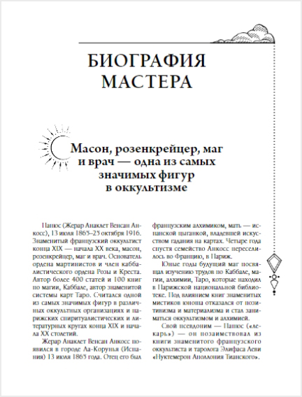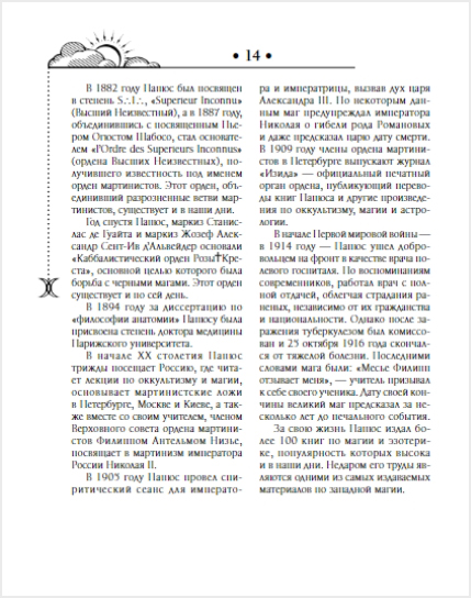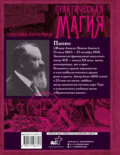 Оставить отзыв«Практическая магия» – один из лучших учебников магии, созданный великим оккультистом и астрологом XIX–XX веков Папюсом, известным также под именем Жерар Анаклет Венсан Анкосс, – масоном, розенкрейцером, врачом. Папюс является основателем ордена мартинистов и членом каббалистического ордена розы и креста, а также автором более 400 статей и 100 книг по магии, каббале и автором знаменитой системы карт Таро.