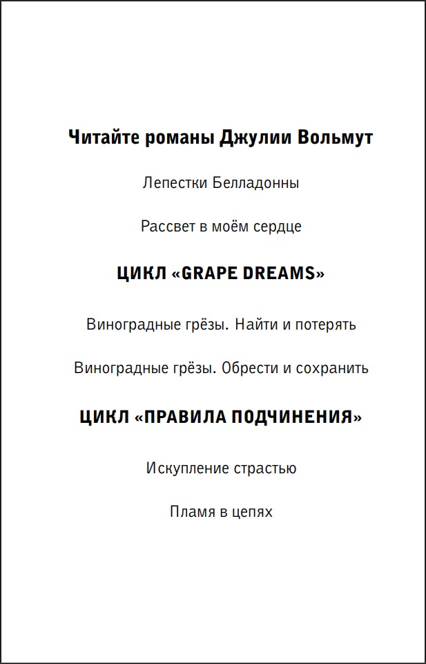 Книги Джулии Вольмут – это истории любви, в которых эмоции искрят будто оголенные нервы. Сквозь боль, непонимание и страхи герои двигаются вперед в надежде получить то, чего хотят, или то, чего думают, что хотят.