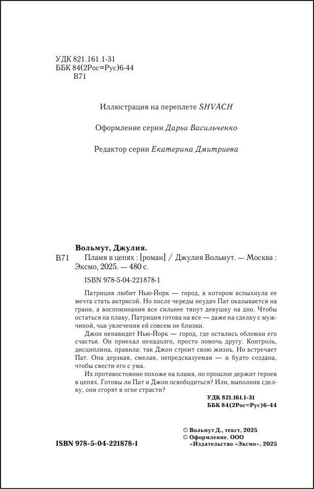 Оставить отзывКниги Джулии Вольмут – это истории любви, в которых эмоции искрят будто оголенные нервы. Сквозь боль, непонимание и страхи герои двигаются вперед в надежде получить то, чего хотят, или то, чего думают, что хотят.
