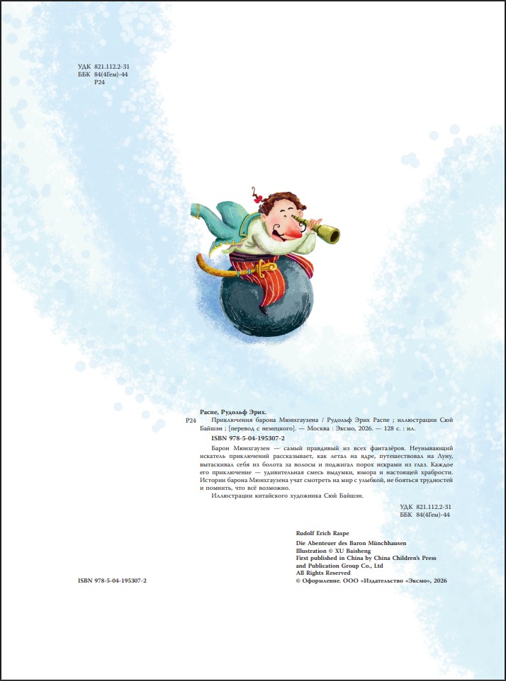 Каждое его приключение – удивительная смесь выдумки, юмора и настоящей храбрости. Истории барона Мюнхгаузена учат смотреть на мир с улыбкой, не бояться трудностей и помнить, что все возможно. Иллюстрации китайского художника Сюй Бошэн.