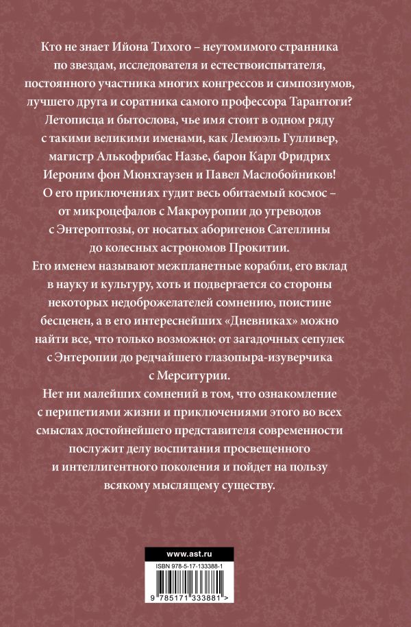 Кто не знает Ийона Тихого – неутомимого странника по звездам, исследователя и естествоиспытателя, постоянного участника многих конгрессов и симпозиумов, лучшего друга и соратника самого профессора Тарантоги? Летописца и бытослова, чье имя стоит в одном ряду с такими великими именами, как Лемюэль Гулливер, магистр Алькофрибас Назье, барон Карл Фридрих Иероним фон Мюнхгаузен и Павел Маслобойников! О его приключениях гудит весь обитаемый космос – от микроцефалов с Макроуропии до угреводов с Энтероптозы, от носатых аборигенов Сателлины до колесных астрономов Прокитии.