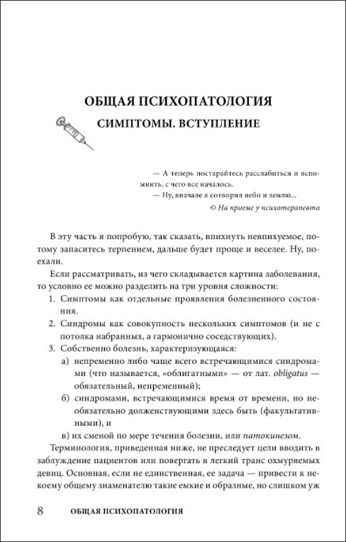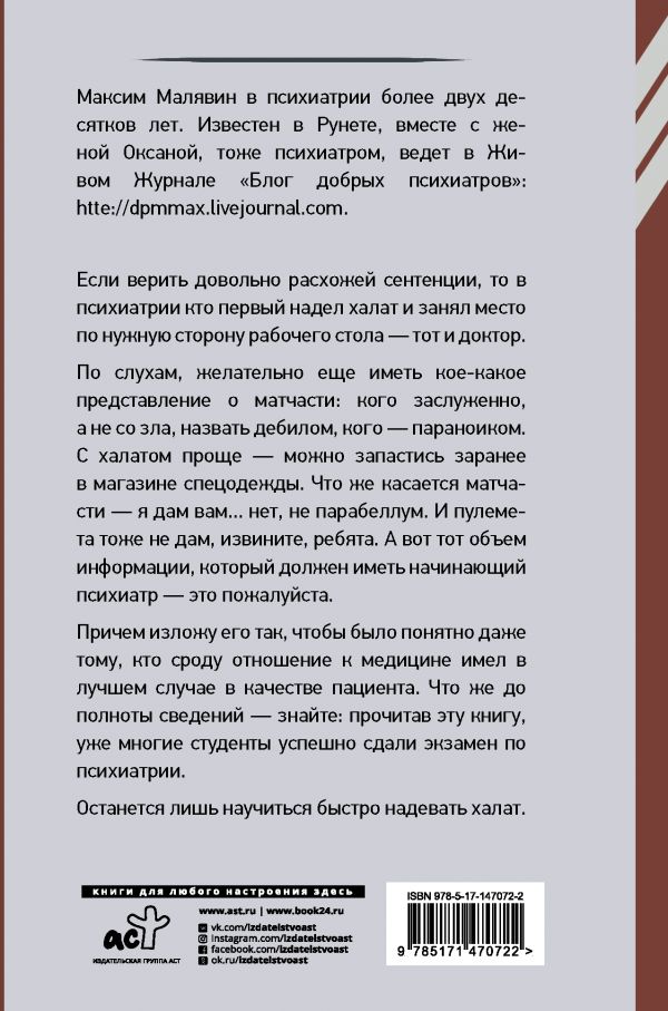 Оставить отзывЕсли верить довольно расхожей сентенции, то в психиатрии кто первый надел халат и занял место по нужную сторону рабочего стола – тот и доктор. По слухам, желательно еще иметь коекакое представление о матчасти: кого заслуженно, а не со зла, назвать дебилом, кого – параноиком. С халатом проще – можно запастись заранее в магазине спецодежды. Что же касается матчасти – я дам вам... нет, не парабеллум. И пулемета тоже не дам, извините, ребята. А вот тот объем информации, который должен иметь любой начинающий психиатр,– это пожалуйста. Причем изложу его так, чтобы было понятно даже тому, кто сроду отношение к медицине имел в лучшем случае в качестве пациента. Что же до полноты сведений – знайте: прочитав эту книгу, уже многие студенты успешно сдали экзамен по психиатрии. Останется лишь научиться быстро надевать халат.