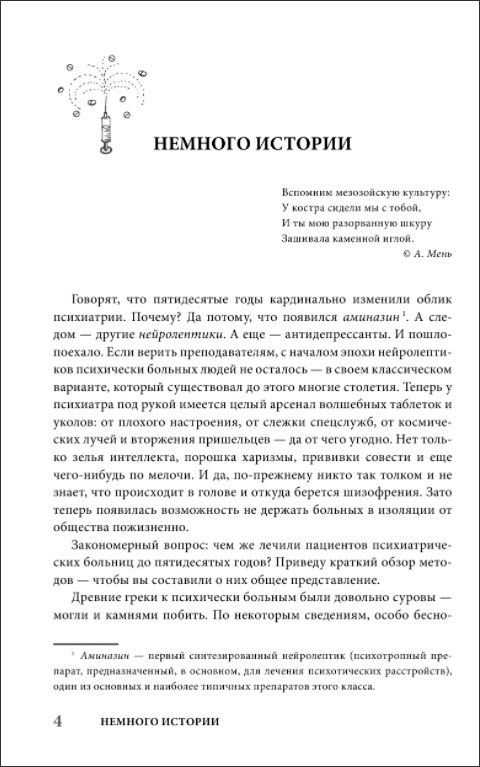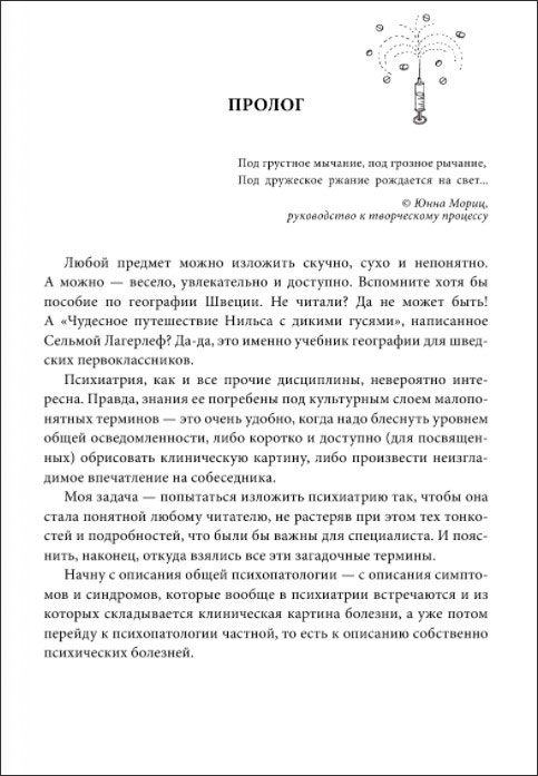Если верить довольно расхожей сентенции, то в психиатрии кто первый надел халат и занял место по нужную сторону рабочего стола – тот и доктор. По слухам, желательно еще иметь коекакое представление о матчасти: кого заслуженно, а не со зла, назвать дебилом, кого – параноиком. С халатом проще – можно запастись заранее в магазине спецодежды. Что же касается матчасти – я дам вам... нет, не парабеллум. И пулемета тоже не дам, извините, ребята. А вот тот объем информации, который должен иметь любой начинающий психиатр,– это пожалуйста. Причем изложу его так, чтобы было понятно даже тому, кто сроду отношение к медицине имел в лучшем случае в качестве пациента. Что же до полноты сведений – знайте: прочитав эту книгу, уже многие студенты успешно сдали экзамен по психиатрии. Останется лишь научиться быстро надевать халат.