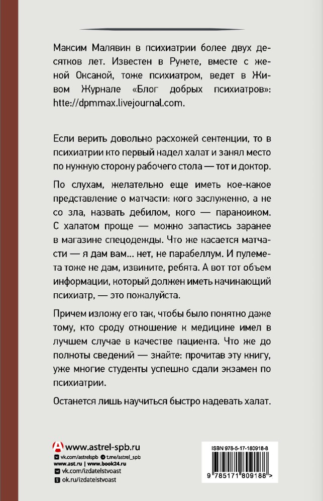 Оставить отзывЕсли верить довольно расхожей сентенции, то в психиатрии кто первый надел халат и занял место по нужную сторону рабочего стола – тот и доктор. По слухам, желательно еще иметь кое-какое представление о матчасти: кого заслуженно, а не со зла, назвать дебилом, кого – параноиком.