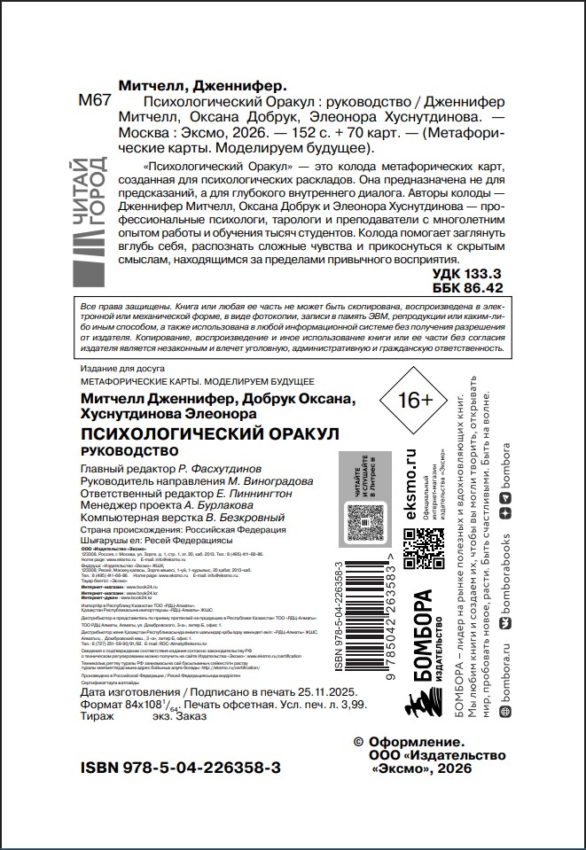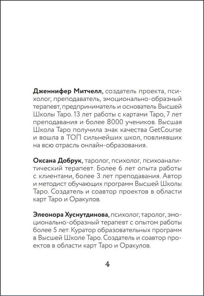 Авторы колоды – Дженнифер Митчелл, Оксана Добрук и Элеонора Хуснутдинова – профессиональные психологи, тарологи и преподаватели с многолетним опытом работы и обучения тысяч студентов.
