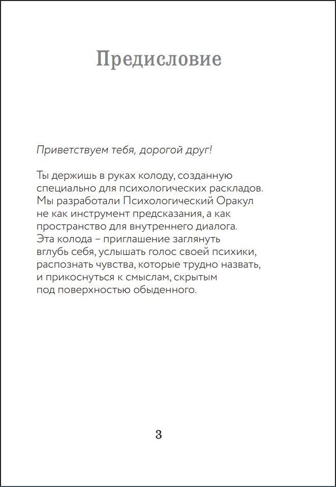 Оставить отзыв«Психологический Оракул» – уникальный инструмент для самопознания и глубокого внутреннего диалога. Эта колода создана не для предсказаний, а для того, чтобы помочь вам раскрыть внутренние ресурсы, осознать скрытые мотивы и найти ответы внутри себя.