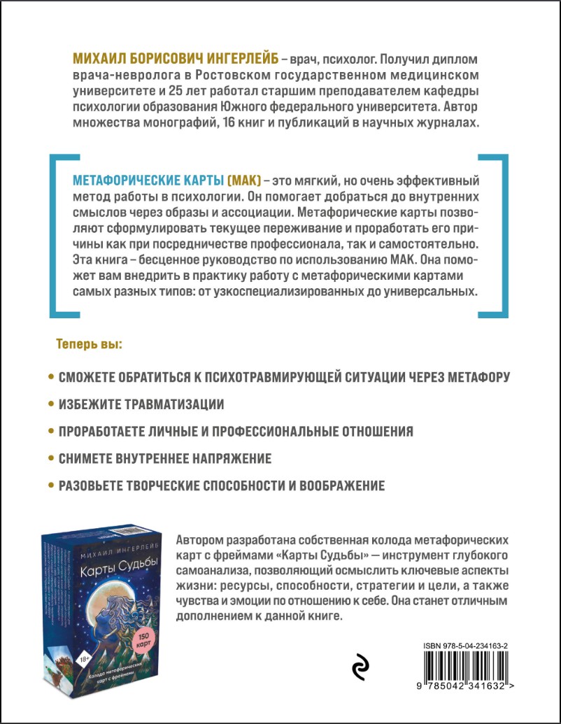 Оставить отзывМихаил Ингерлейб – автор с колоссальным опытом ведения психотерапевтических групп. Автор нескольких книг по психологии, в том числе по метафорическим картам.