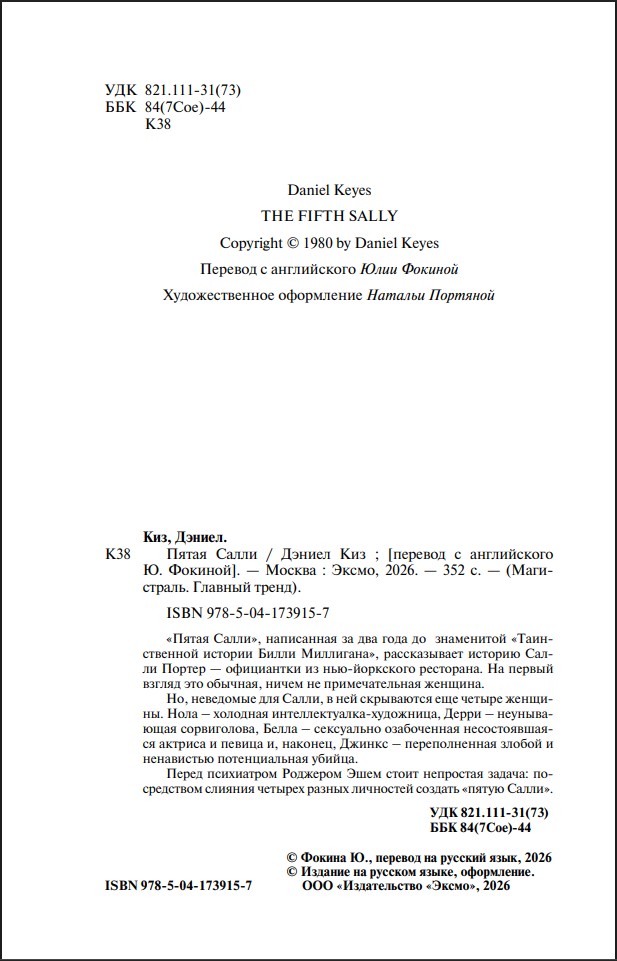 «Пятая Салли», написанная за два года до знаменитой «Таинственной истории Билли Миллигана», рассказывает историю Салли Портер – официантки из нью-йоркского ресторана. На первый взгляд это обычная, ничем не примечательная женщина.