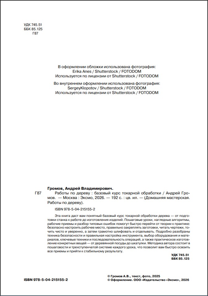 Эта книга даст вам понятный базовый курс токарной обработки дерева – от подготовки станка к работе до изготовления изделий. Пошаговые уроки, наглядные алгоритмы, рабочие приемы и разбор типовых ошибок помогут быстро перейти от теории...
