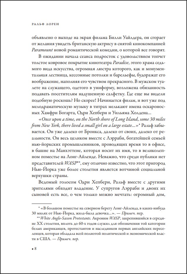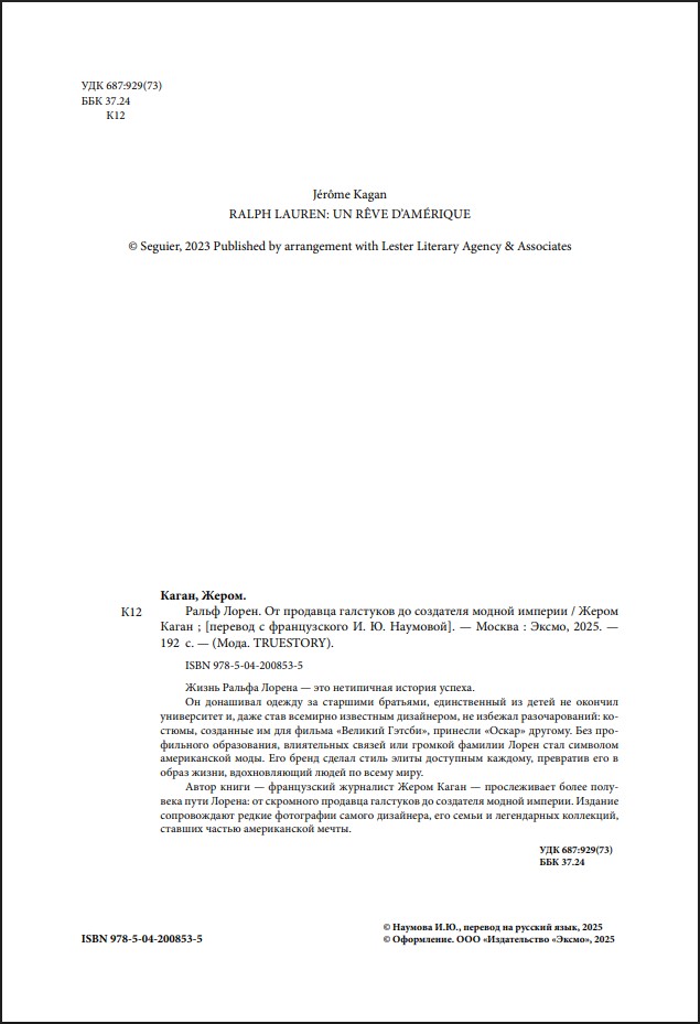 Автор книги, французский журналист Жером Каган, прослеживает более полувека пути Лорена: от скромного продавца галстуков до создателя модной империи. Издание сопровождают редкие фотографии самого дизайнера, его семьи и легендарных коллекций, ставших частью американской мечты.