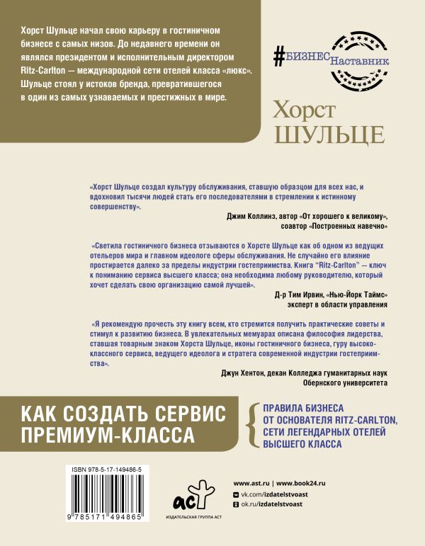 «Светила гостиничного бизнеса отзываются о Хорсте Шульце как об одном из ведущих отельеров мира и главным идеологом сферы обслуживания. Не случайно его влияние простирается далеко за пределы индустрии гостеприимства. Книга «Ritz-Carlton» – ключ к пониманию сервиса высшего класса; она необходима любому руководителю, который хочет сделать свою организацию самой лучшей»