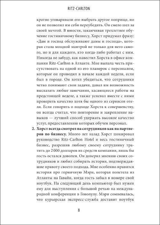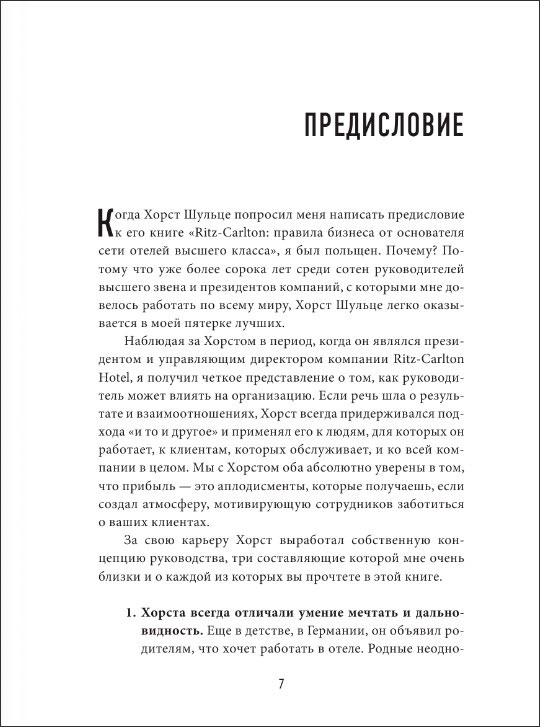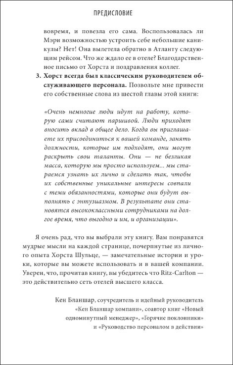 «Я рекомендую прочесть эту книгу всем, кто стремится получить практические советы и стимул к развитию бизнеса. В увлекательных мемуарах описана философия лидерства, ставшая товарным знаком Хорста Шульце, иконы гостиничного бизнеса, гуру высококлассного сервиса, ведущего идеолога и стратега современной индустрии гостеприимства».