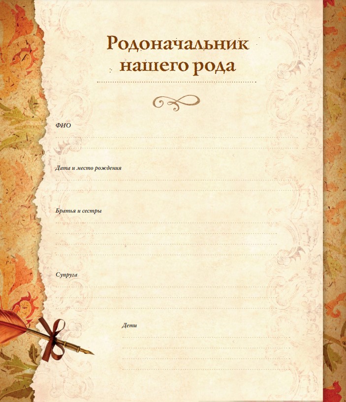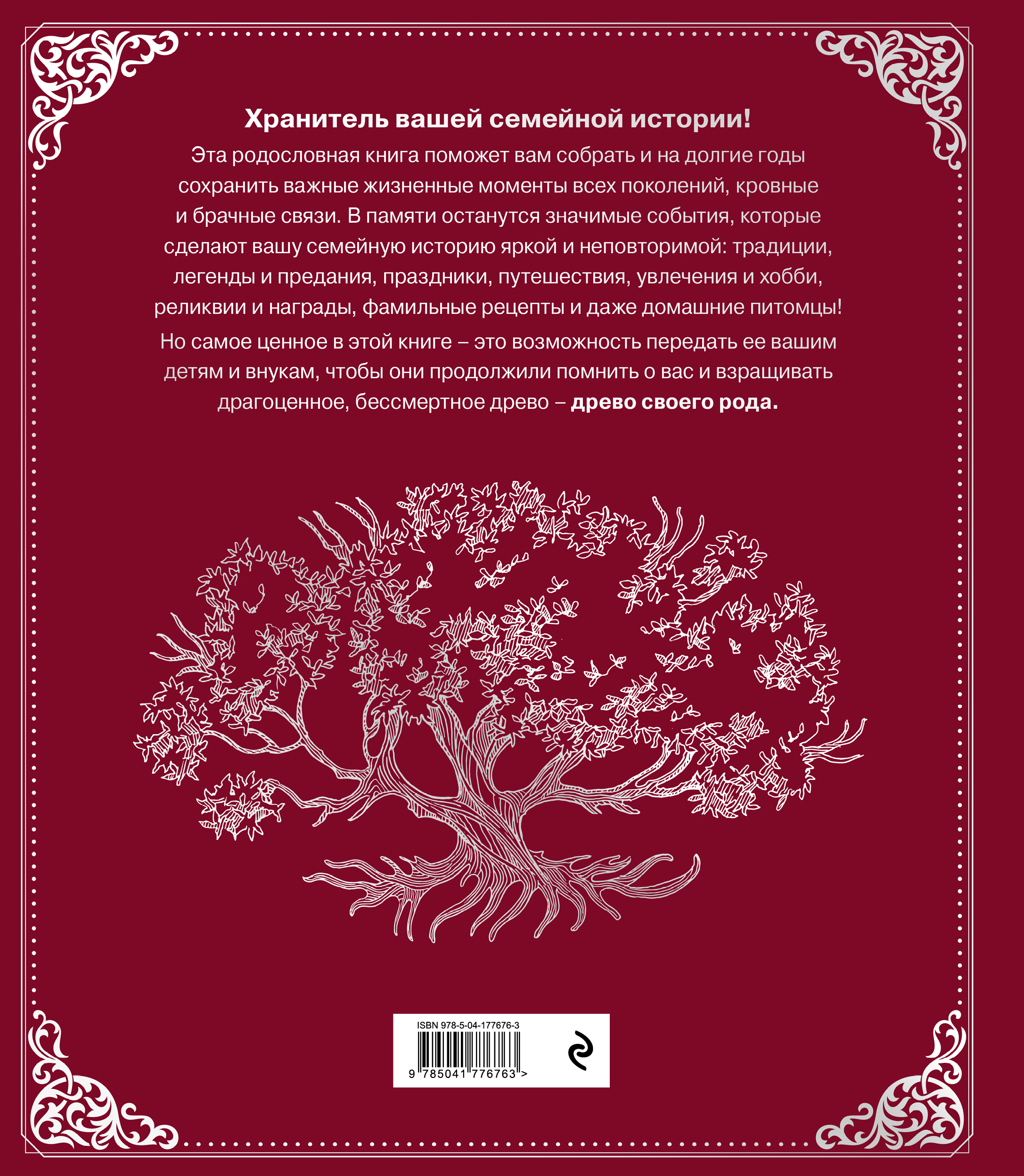 Перед вами – родословная книга, которая может стать настоящей реликвией вашей семьи. Из тех, которые хранят десятилетиями, а то и веками, с особенным волнением и уважением. Эта книга поможет вам собрать воедино и систематизировать историю вашей семьи. Она надежно сохранит информацию о родоначальнике и истоках вашего рода, важных жизненных вехах его представителей, сведения о занятиях и образе жизни поколений, бесценные фотографии. Останутся в памяти и другие вещи, которые сделают вашу семейную историю яркой и неповторимой: традиции, легенды и предания, праздники, путешествия, увлечения и хобби, реликвии и награды, фамильные рецепты и даже домашние питомцы. Но самое ценное в этой книге – это возможность передать ее своим детям и внукам, чтобы они продолжили взращивать драгоценное, бессмертное древо своего рода.