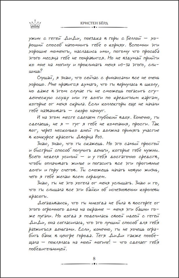 Дакота Грин скорее бы согласилась участвовать в «Голодных играх», чем в ежегодном конкурсе красоты города Оберджин. Но последнее желание покойной матери вынуждает её сменить рабочие сапоги на шпильки и раскрыть давнюю тайну пропавшей королевы...