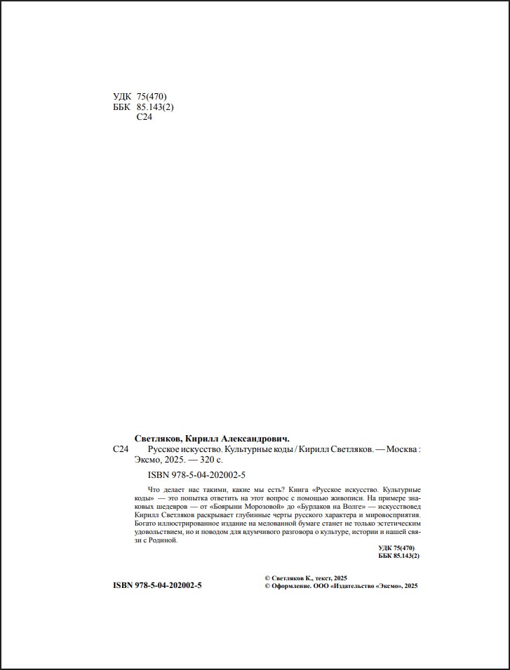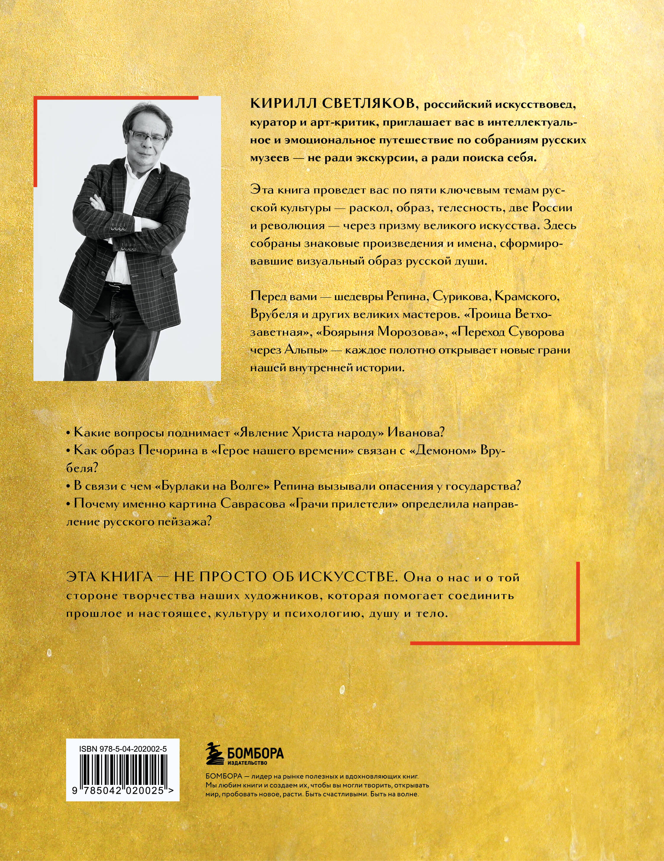 Вместе с богатым иллюстративным рядом автор книги – Кирилл Светляков, известный искусствовед, куратор выставок, арт-критик – предлагает доступное, но глубокое прочтение ключевых образов русской живописи, помогает увидеть за формой – содержание, за сюжетом – идею, за красками – культурный код.
