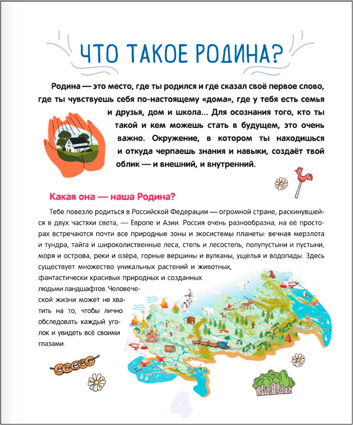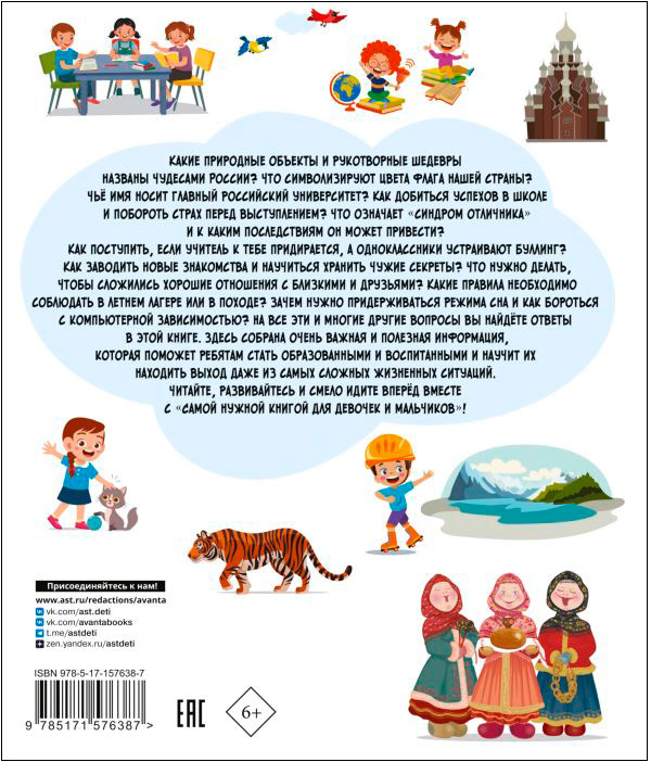 Оставить отзывДорогие родители, наверняка вы делаете всё, чтобы ваши дети росли и здоровыми, и умными, и воспитанными. Представляем вашему вниманию удивительную книгу, которая откроет перед ребятами мир увлекательных и важных знаний, касающихся каждого мальчика и девочку. Это увлекательное и практичное руководство поможет им освоить основные правила безопасности и этикета, подскажет, как быть здоровыми и активными, как справляться с различными жизненными трудностями. Здесь они найдут множество интересных историй, примеров и практических советов, которые помогут детям разобраться в такой важной сфере, как общение: с учителями, одноклассниками, родными. Кроме того, в книге содержится интересная и нужная информация о России, изучить которую должен каждый ребёнок, ведь все мы являемся частью огромной страны.