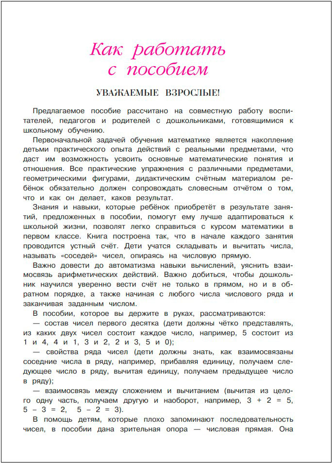 Выполняя интересные игровые задания, ребенок освоит состав числа в пределах 10, будет решать примеры и задачи на сложение и вычитание с помощью числовой прямой, сравнивать числа, потренируется в составлении и решении задач. Знания, умения и навыки, которые дошкольник приобретет в результате занятий, позволят ему почувствовать уверенность в себе и в дальнейшем их успешно использовать. Кроме того, в пособии имеются методические рекомендации, которые подскажут, как правильно организовать занятие с ребенком.