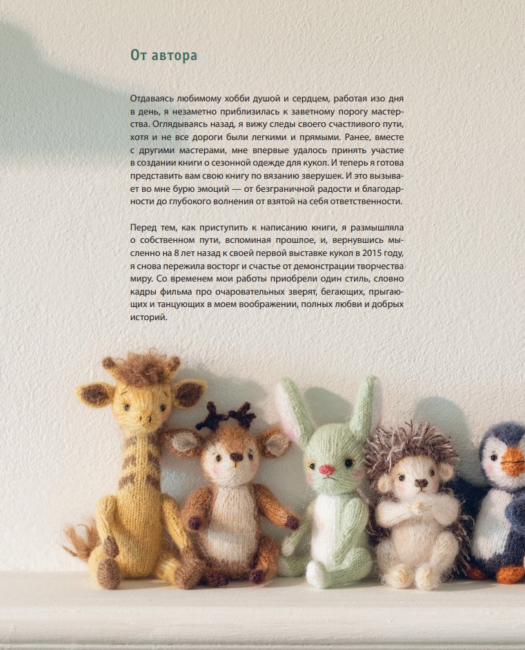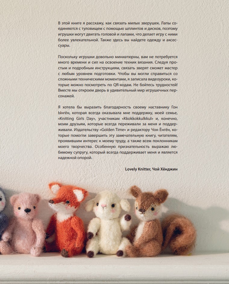 Вы освоите создание подвижных мишек, зайчиков и лисичек с гибкими лапками. Эти очаровательные существа буквально оживают в руках, а миниатюрные вязаные комбинезончики, шапочки и сумочки, выполненные с типично корейским чувством стиля, добавят вашим творениям особого шарма.