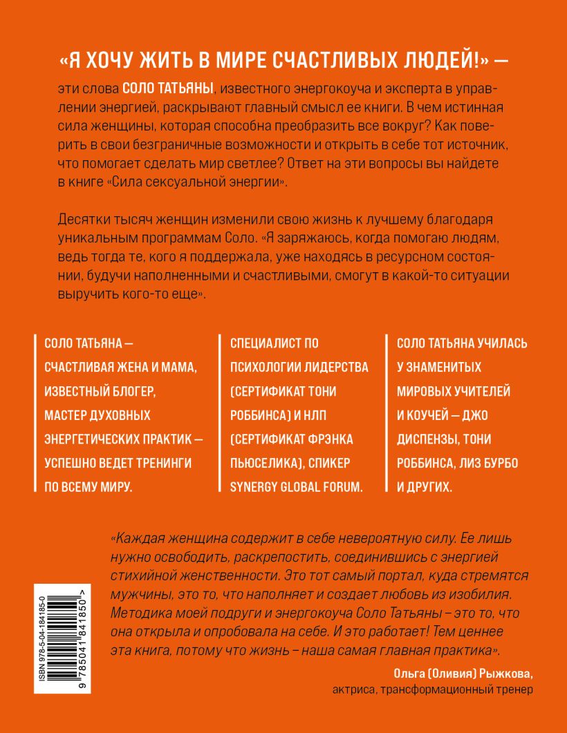 Автор книги-тренинга «Сила сексуальной энергии» Соло Татьяна – энергокоуч с мировым именем, известный блогер и эксперт в управлении энергией – училась у знаменитых учителей: Джо Диспензы, Тони Роббинса, Лиз Бурбо. В ее книге даны эффективные практики по раскрытию мощного энергетического ресурса и сексуальности. В чем истинная сила женщины, которая способна преобразить все вокруг? Как поверить в свои безграничные возможности и открыть в себе тот источник, что помогает сделать мир светлее? Как разблокировать свою энергию, проявить ее, убрать негативные установки, наполнить себя любовью и почувствовать себя по-настоящему счастливой? Ответы на эти вопросы вы найдете в книге Соло Татьяны.