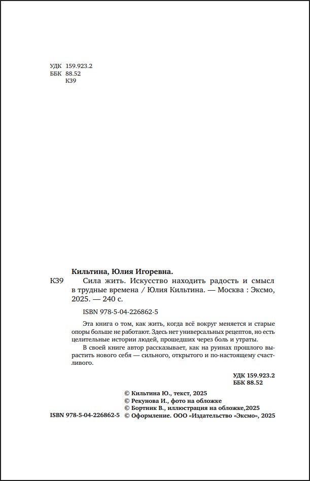 Юлия Кильтина – врач, заведующая отделением в хосписе и талантливый писатель. Более 16 лет она помогает пациентам и их родным справиться с тяжелыми испытаниями. В своей книге она делится историями реальных людей и рассказывает, как на руинах прошлого вырастить нового себя – сильного, открытого и по-настоящему счастливого.