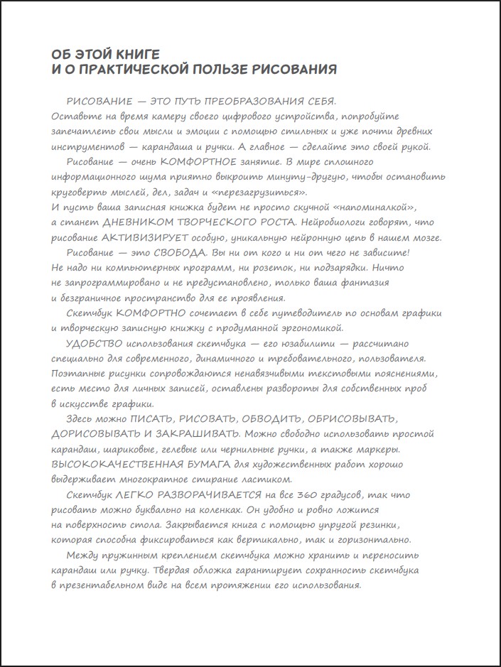Скетчбук – это книга для современных людей, ищущих яркие, креативные формы развития личности, желающих обогатить свою жизнь художественными образами. С ее помощью каждый сумеет открыть для себя новые горизонты творческого сознания, раскрыть потенциал подсознания и раскрепостить воображение. Доверьтесь своей интуиции – и превратите поиски себя в произведение искусства.